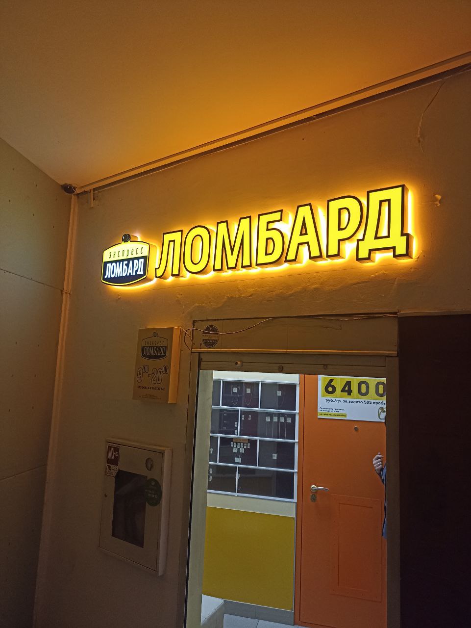 Вывеска Ломбард, логотип и буквы изготовлены по технологии жидкий акрил, борт алюминиевый фрезерован на бортогибочном станке. Контражурная подсветка.
